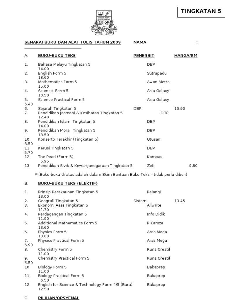 Senarai harga buku teks spbt Berikut adalah senarai harga buku teks yang diperakukan mengikut tingkatan. Pgi cipta sdn bhd. Senarai harga buku teks t5 1.